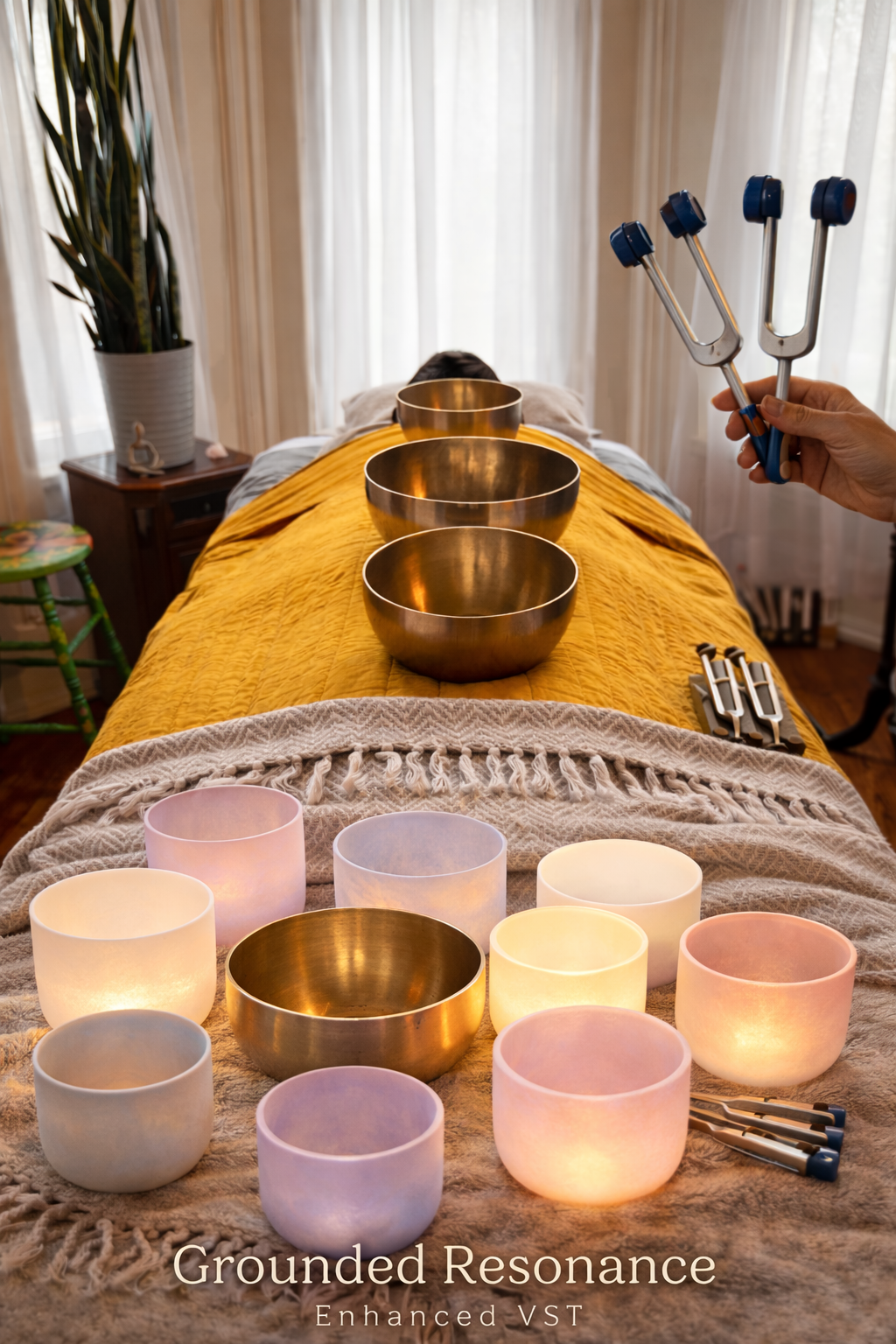 Grounded Resonance: Enhanced VST is an integrative vibrational sound therapy session featuring on-body bronze singing bowls, a grounding 432 Hz crystal singing bowl beneath the table, and tuning forks. This fully clothed, 50-minute experience is designed to support nervous system regulation, deep relaxation, and a felt sense of embodied calm.