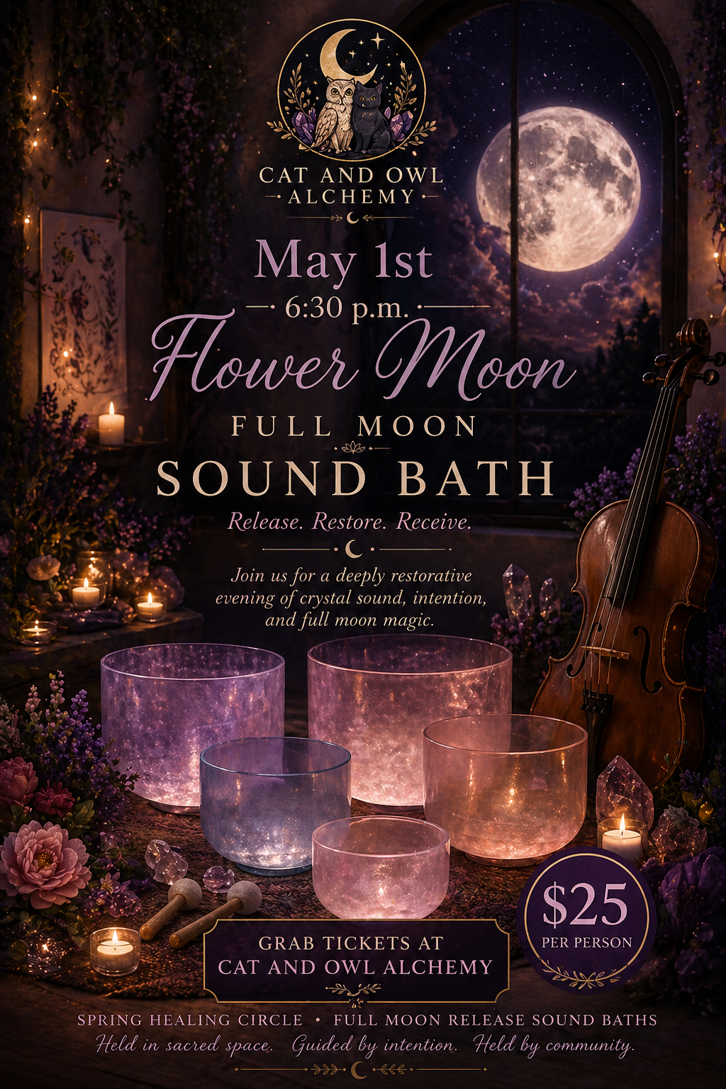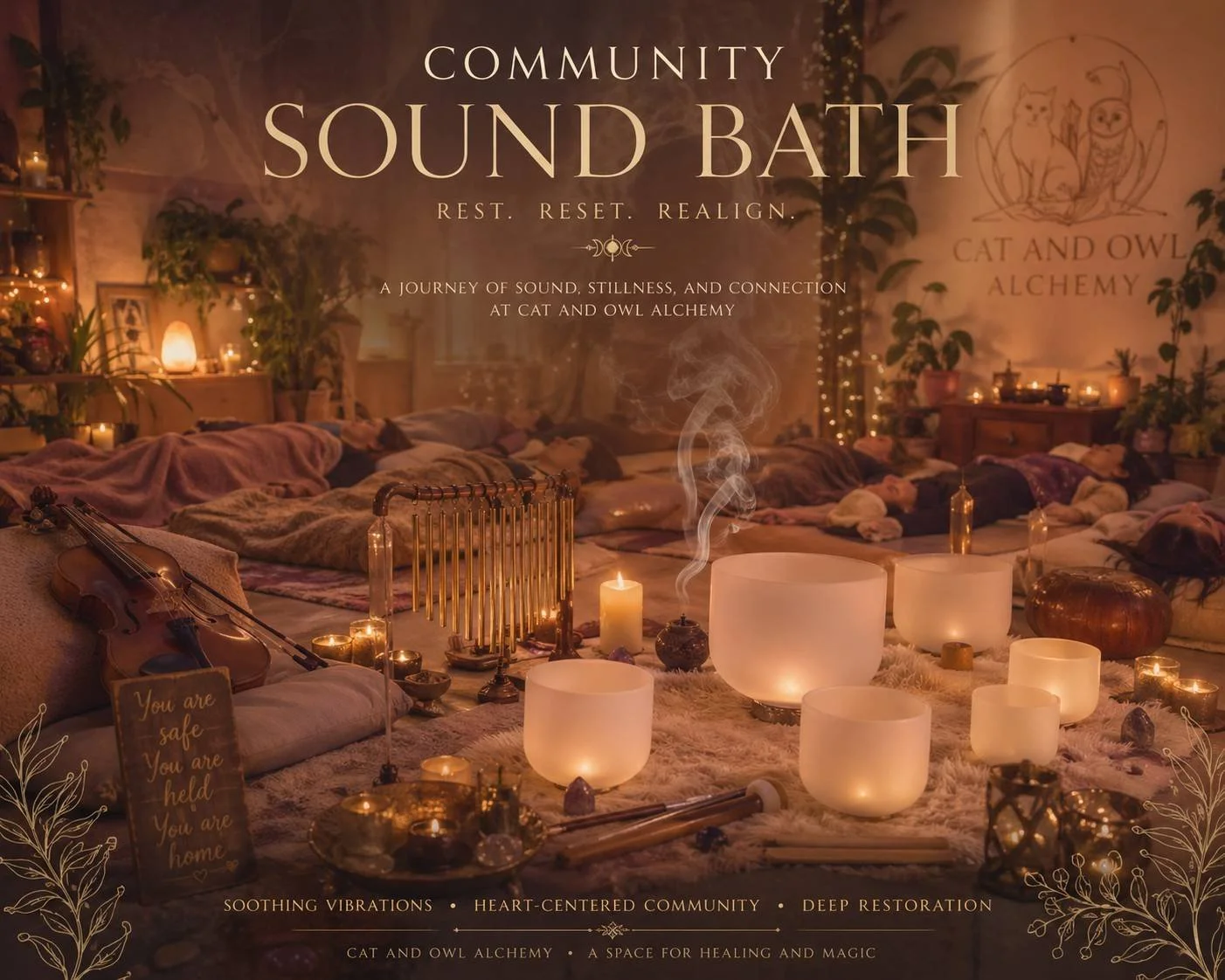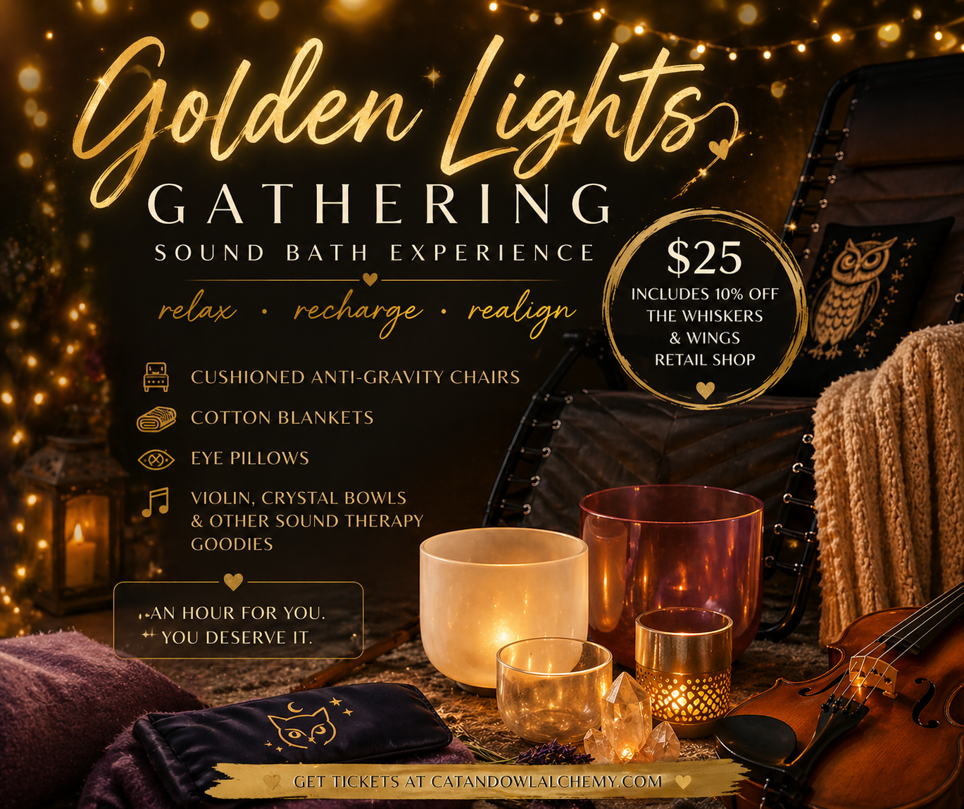 Golden Lights Gathering is a soft landing into the warmth of spring and summer, where golden hour melts into sound. Surrounded by soothing tones, gentle vibrations, and a calm evening glow, this sound bath invites your body to unwind and your spirit to breathe a little deeper. Let the light linger, the mind quiet, and the heart open. ✨