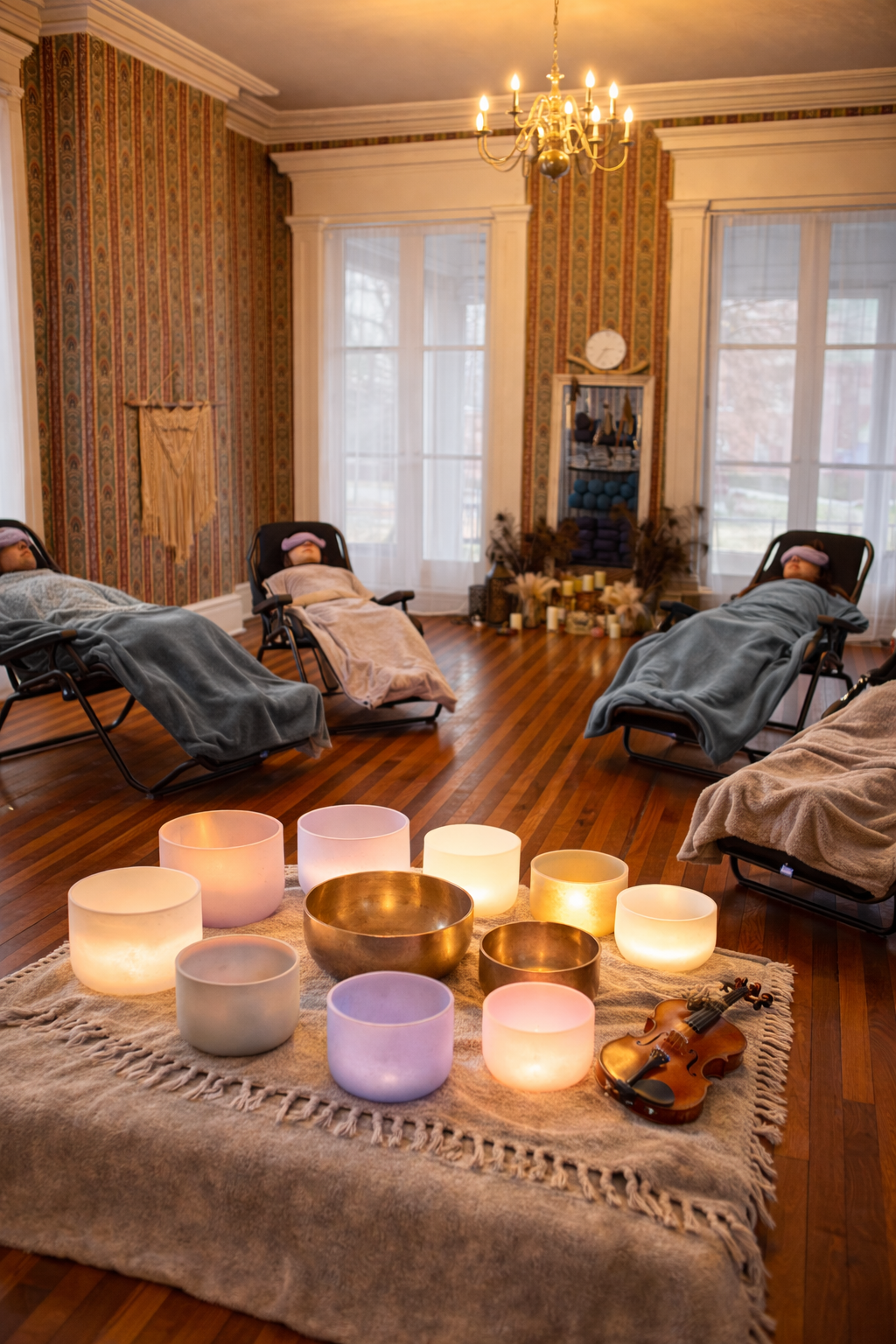 Sound Baths are immersive, deeply relaxing experiences where crystal singing bowls, violin, and gentle sound waves wash over you. As you rest comfortably under blankets with eye pillows, the sounds help calm the nervous system, release tension, and invite a sense of peace, clarity, and restoration, no effort required, just receive.